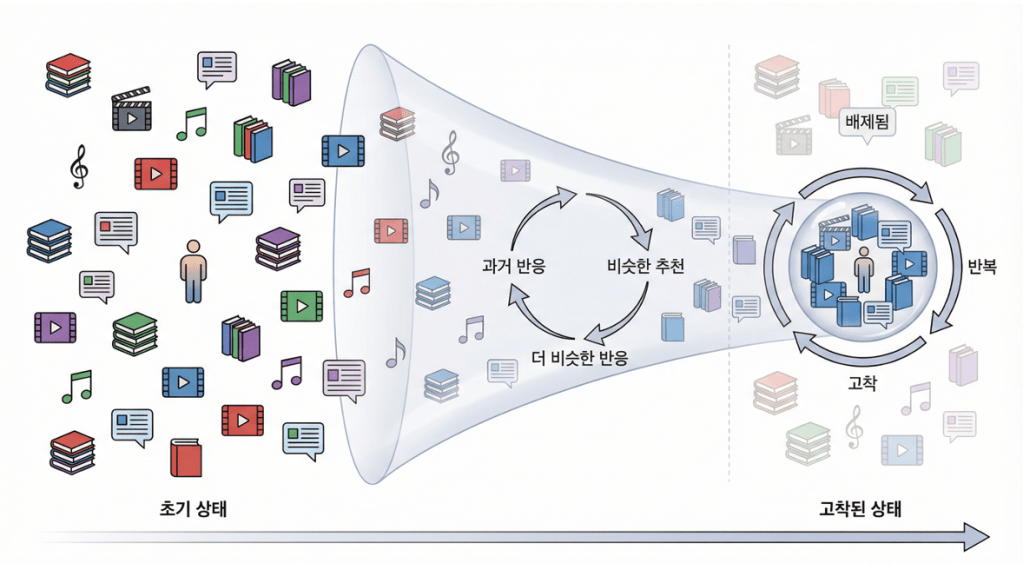 중요한 점은 추천이 중립적인 정보 제공이 아니라, 경험의 경로를 설계하는 행위라는 사실입니다. 사용자는 스스로 선택한다고 느끼지만, 실제로는 시스템이 허용한 범위 안에서만 선택합니다. 이 제한된 경험은 다시 제한된 행동 로그를 만들고, 이는 다시 같은 추천을 강화합니다.