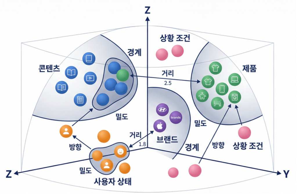 즉, 하나의 점은 단순한 데이터 표현이 아니라 의미의 결합 결과입니다. 이렇게 정의된 좌표는 단순히 “가깝다 / 멀다”를 넘어서, 어떤 의미를 가지는지 해석할 수 있는 구조를 갖게 됩니다.