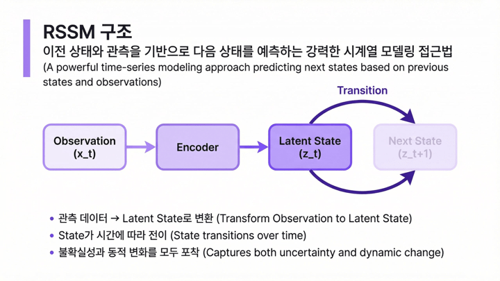 그래서 RSSM은 단순한 시퀀스 예측 모델이 아니라, 시간에 따라 변화하는 잠재 상태를 유지하고, 미래를 시뮬레이션하는 모델로 이해할 수 있습니다. 월드 모델(World Model)이나 모델 기반 강화학습(Model-based Reinforcement Learning)에서 RSSM이 중요한 이유도 여기에 있습니다.