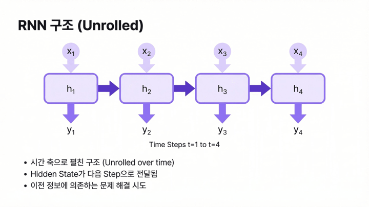 기술적으로 보면 RNN의 장점은 명확했습니다. 네트워크 구조를 시간축으로 반복 적용할 수 있고, 입력 길이가 달라져도 같은 셀 구조를 계속 사용할 수 있습니다. 덕분에 시퀀스 길이에 유연하고, 당시 기준으로는 매우 자연스러운 시간 모델이었습니다.