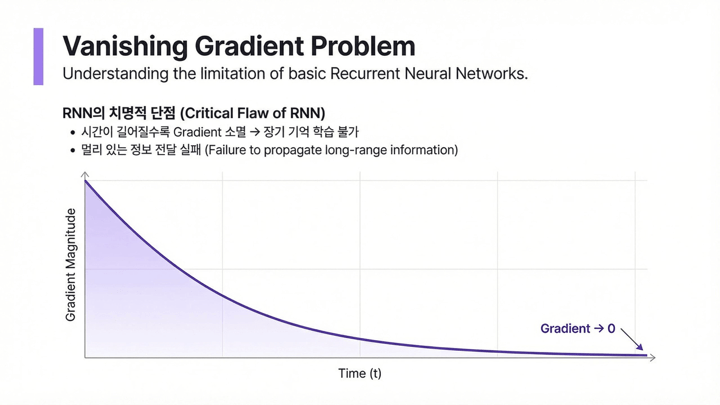 RNN은 시간을 도입했다는 점에서는 중요한 전환이었지만, 긴 시간을 제대로 기억하는 데에는 구조적 약점이 있었습니다.