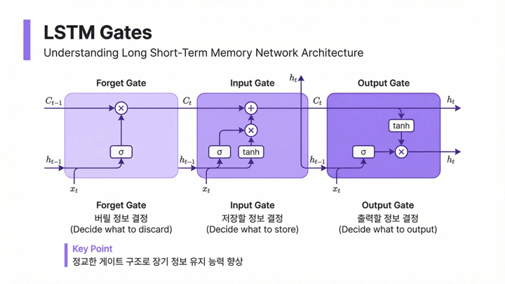 LSTM의 핵심은 기억을 단순히 보존하는 것이 아니라 선택적으로 관리하는 것입니다. 이를 위해 여러 개의 게이트가 도입됩니다. 어떤 정보는 잊고, 어떤 정보는 새로 받아들이고, 어떤 정보는 지금 당장 출력에 반영합니다. 즉 모델이 상태를 수동적으로 전달하는 것이 아니라, 내부적으로 정보의 유입과 유지와 배출을 제어하게 됩니다.