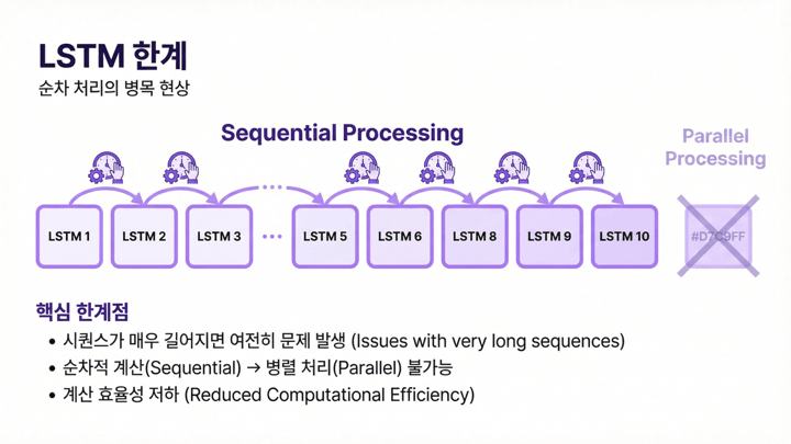 하지만 LSTM에도 분명한 한계가 있었습니다. 가장 큰 문제는 여전히 순차 처리라는 점입니다. t시점 계산이 끝나야 t+1시점으로 갈 수 있기 때문에 병렬화가 어렵습니다. 시퀀스가 길어질수록 계산 시간이 늘어나고, GPU 병렬 처리의 장점을 충분히 살리기 어렵습니다. 또한 상태를 계속 하나의 벡터 안에 압축해야 하므로, 복잡한 정보가 많아질수록 병목이 생길 수밖에 없습니다.