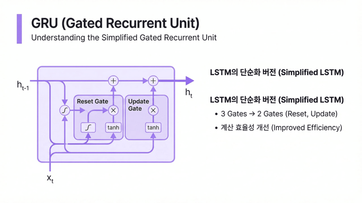 GRU는 LSTM의 철학을 유지하면서 구조를 더 간결하게 만든 모델입니다. 기억을 선택적으로 유지하고 갱신하는 방식은 비슷하지만, 셀 상태와 hidden state를 별도로 두지 않고 게이트 수를 줄여 더 가볍게 설계되었습니다.