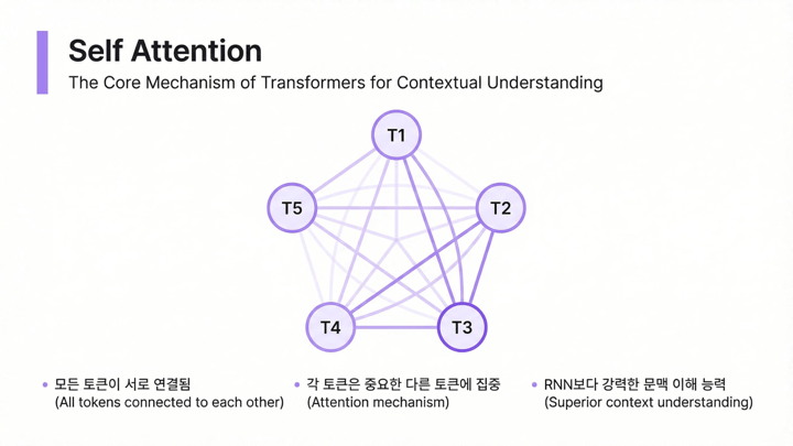 멀리 떨어진 토큰이라도 직접 연결해 볼 수 있기 때문에, 문장 초반의 단어와 후반의 단어 관계를 더 잘 포착할 수 있습니다. 자연어 처리에서 문맥 이해 성능이 급격히 향상된 이유입니다.